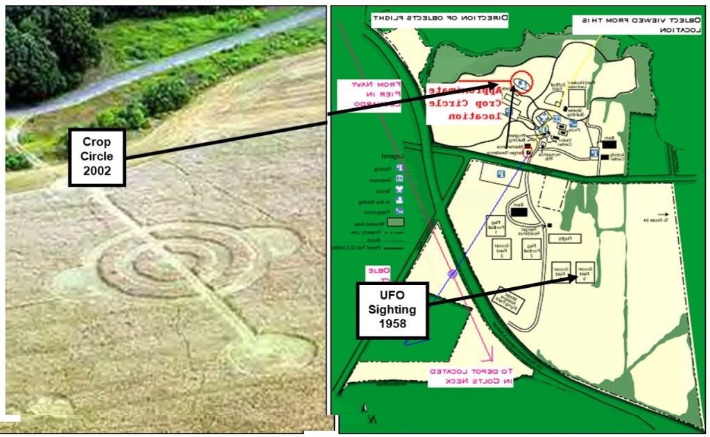 2) The next is a crop circle that showed up on a farm that I lived on as a child (the crop circle showed up in 2002, my family’s sighting was in July of 1958). This is my story of “synchronicity”. In the summer of 1958, we observed our first daylight sphere that was flying lazily along what we know as the “Navy Road” (actual name is Normandy road) that is owned and used by the US Navy to move munitions to and from ships in Raritan bay and the storage facilities about 13 miles to the south (Colts Neck).